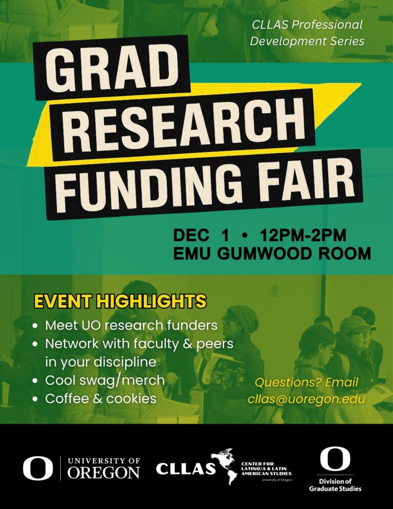The Center for Latino/a and Latin American Studies (CLLAS) at University of Oregon fosters student and faculty research initiatives that focus on Latinx and Latin American issues across Oregon, the U.S., Latin America, and beyond. Upcoming Events Funding Opportunities Research Dissemination Latino Roots Project ResearchArchive Upcoming Event Graduate Research Funding FaireMonday, Dec. 1 | 🕐 12pm-2pm | 📍 EMU Gumwood RoomConnect and learn about research funding opportunities at University of Oregon!