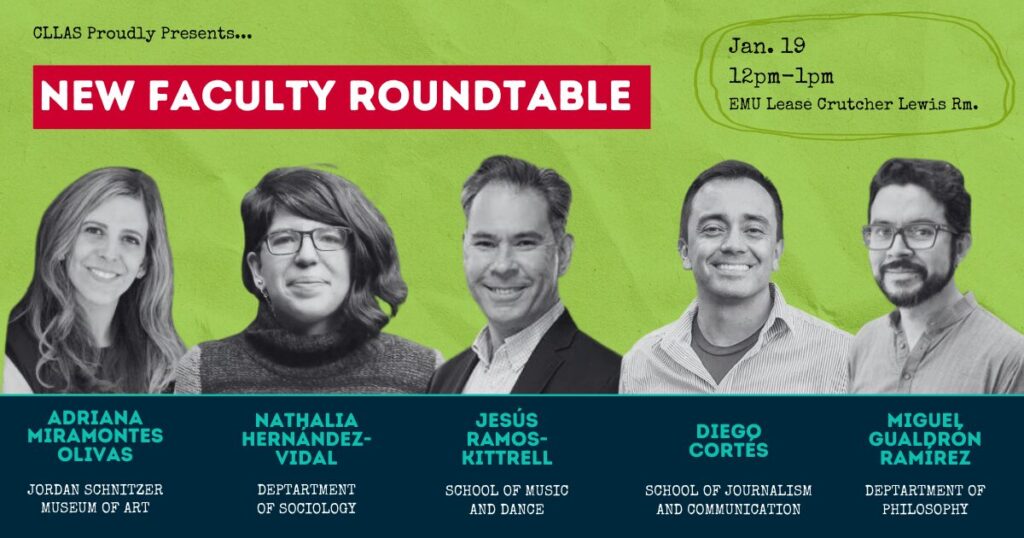 Assistant Professor of Musicology, School of Music and DanceMiguel Gualdrón RamírezAssistant Professor, Department of Philosophy Nathalia Hernández-VidalAssistant Professor, Department of SociologyDiego CortésAssistant Professor of Media Studies, School of Journalism and CommunicationPlease join us in welcoming these faculty members to UO and learning about their research, coursework, and the valuable contributions they will make in educating students about Latino/a and Latin American issues across various disciplines. We hope to see you there!Event Details:New Faculty RoundtableJanuary 19 from 12pm-1pmEMU Lease Crutcher Lewis RoomLunch will be provided (event is limited to 30 attendees)