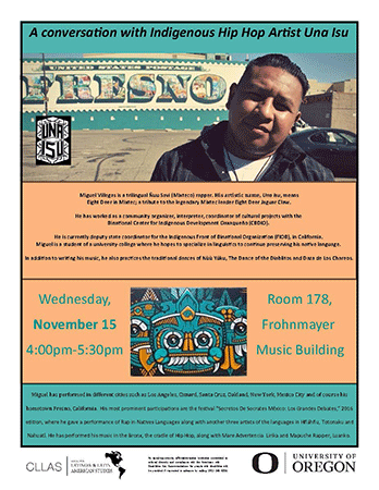 Miguel Villegas is a trilingual Ñuu Savi (Mixteco) rapper. His artistic name, Una Isu, means Eight Deer in Mixtec; a tribute to the legendary Mixtec leader Eight Deer Jaguar Claw. He has worked as a community organizer, interpreter, coordinator of cultural projects with the Binational Center for Indigenous Development Oaxaqueño (CBDIO).