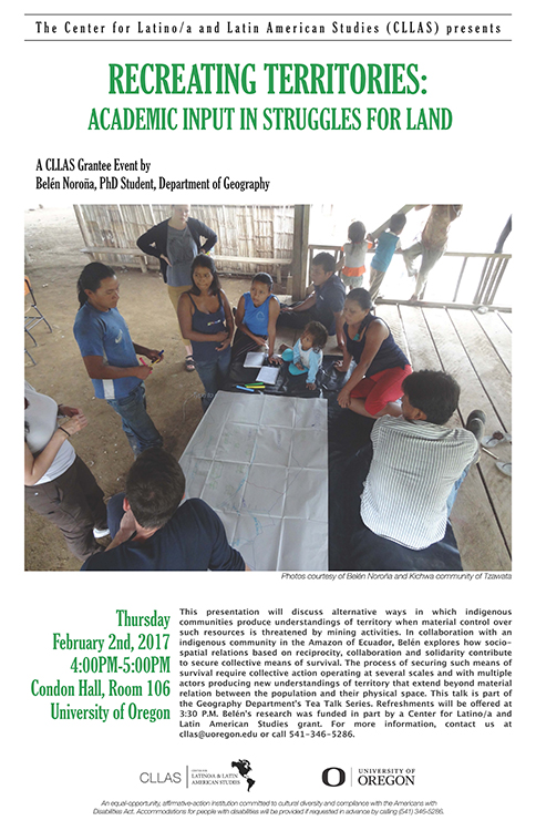 María Belén Noroña, a graduate teaching fellow in the Department of Geography, will discuss alternative ways in which indigenous communities produce understandings of territory when material control over such resources is threatened by mining activities. In collaboration with an indigenous community in the Amazon of Ecuador, Belén explores how socio-spatial relations based on reciprocity, collaboration and solidarity contribute to secure collective means of survival. The process of securing such means of survival require collective action operating at several scales and with multiple actors producing new understandings of territory that extend beyond material relation between the population and their physical space. This talk is part of the Geography Department’s Tea Talk Series. Refreshments will be offered at 3:30 P.M. Belén’s research was funded in part by a Center for Latino/a and Latin American Studies grant.