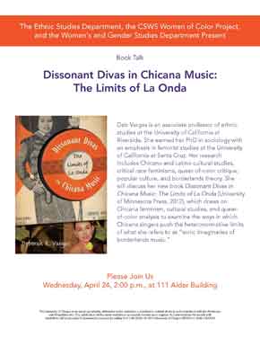 Deb Vargas is an associate professor of ethnic studies at the University of California at Riverside. She earned her PhD in sociology with an emphasis in feminist studies at the University of California at Santa Cruz. Her research includes Chicano and Latino cultural studies, critical race feminisms, queer-of-color critique, popular culture, and borderlands theory. She will discuss her new book Dissonant Divas in Chicana Music: The Limits of La Onda (University of Minnesota Press, 2012), which draws on Chicana feminism, cultural studies, and queer-of-color analysis to examine the ways in which Chicana singers push the heteronormative limits of what she refers to as “sonic imaginaries of borderlands music.”