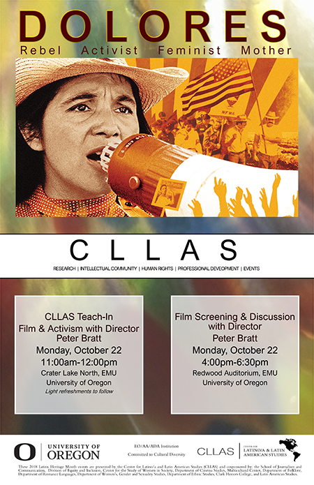Sponsored by the Center for Latino/a and Latin American Studies (CLLAS). Cosponsored by the School of Journalism and Communication, Division of Equity and Inclusion, College of Arts and Sciences, Center for the Study of Women in Society, Department of Cinema Studies, Multicultural Center, Department of Folklore, Department of Romance Languages, Department of Women’s, Gender and Sexuality Studies, Department of Ethnic Studies, Clark Honors College, and Latin American Studies.