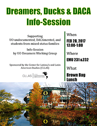 Dreamers, Ducks & DACA Info-SessionBy emeyer / January 15, 2017 EMU 231 & 232 Brown Bag Lunch Info-Session by UO Dreamers Working Group Supporting UO undocumented, DACAmented, and students from mixed status families Sponsored by the Center for Latino/a and Latin American Studies (CLLAS)