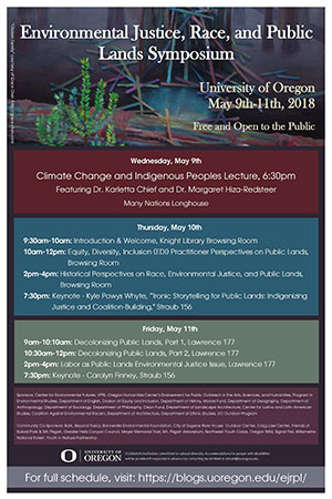 Sponsors: Center for Environmental Futures, VPRI, Oregon Humanities Center’s Endowment for Public Outreach in the Arts, Sciences, and Humanities, Program in Environmental Studies, Department of English, Division of Equity and Inclusion, Department of History, Moore Fund, Department of Geography, Department of Anthropology, Department of Sociology, Department of Philosophy, Dixon Fund, Department of Landscape Architecture, Center for Latino and Latin American Studies, Coalition Against Environmental Racism, Department of Architecture, Department of Ethnic Studies, UO Outdoor Program.