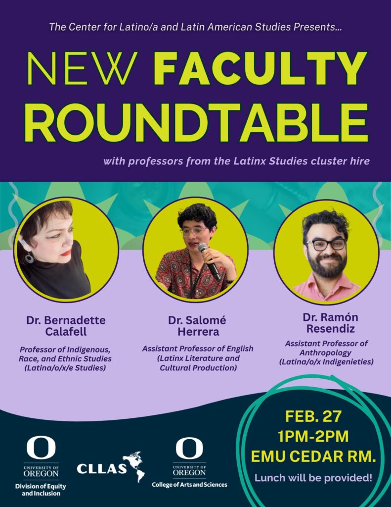 The Center for Latino/a and Latin American Studies (CLLAS) is pleased to announce a dynamic roundtable discussion featuring new University of Oregon faculty members across various departments whose work focuses on Latino/a and Latin American studies.