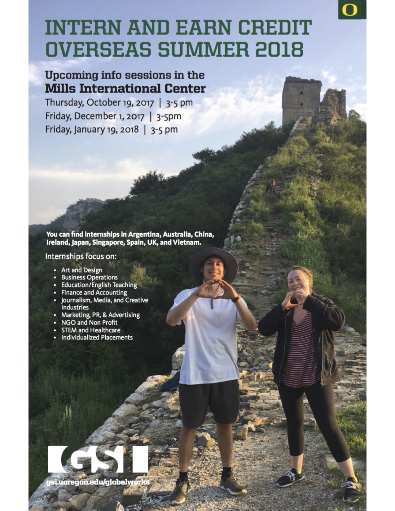 The Global Studies Institute has added several new internship sectors and cities for the UO’s GlobalWorks International Internship program for Summer 2018. Students can learn more at the info sessions scheduled on October 19, December 1, and January 19.