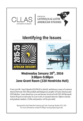 UNESCO just inaugurated its International Decade for People of African Descent and completed its 2015 Conference on Indigenous Peoples and Climate Change. Come join Dr. Juan Eduardo (Ed) Wolf and the Center for Latino/a and Latin American Studies (CLLAS) to identify and discuss the issues related to these events and others of common interest between Afro-descendant and Indigenous peoples of Latin America and UO scholars. The meeting will help decide the future direction of the CLLAS Research Action Project (RAP) dedicated to such issues.