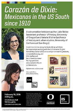 In addition to discussing the book, Weise will share her experiences working with the UO Libraries Digital Scholarship Center (DSC) on a companion teaching website, corazondedixie.org, and DSC staffers will be on hand to answer faculty questions about possible future collaborations. Refreshments will be served. For more information, see flier linked here.
