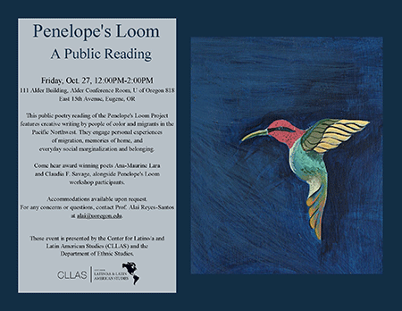 Come hear award winning poets Ana-Maurine Lara and Claudia F. Savage, alongside Penelope’s Loom workshop participants. Accommodations available upon request. For any concerns or questions, contact Prof. Alai Reyes-Santos at alai@uoregon.edu.