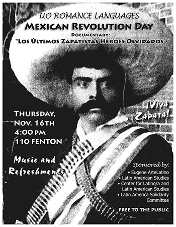 Sponsored by UO Department of Romance Languages and cosponsored by Eugene ArteLatino, Latin American Studies, Center for Latino/a and Latin American Studies (CLLAS), and Latin America Solidarity Committee.