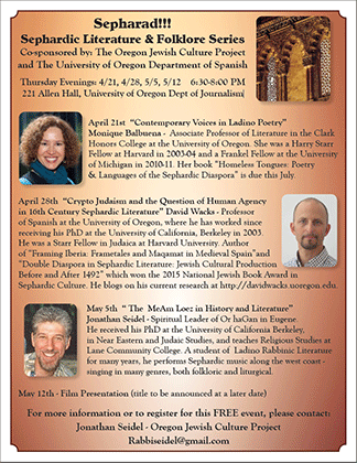 David Wacks – Professor of Spanish at the University of Oregon, where he has worked since receiving his PhD at the University of California, Berkeley in 2003. He was a Starr Fellow in Judaica at Harvard University. Author of “Framing Iberia: Frametales and Maqamat in Medieval Spain”and “Double Diaspora in Sephardic Literature: Jewish Cultural Production Before and After 1492” which won the 2015 National Jewish Book Award in Sephardic Culture. He blogs on his current research at http://davidwacks.uoregon.edu.