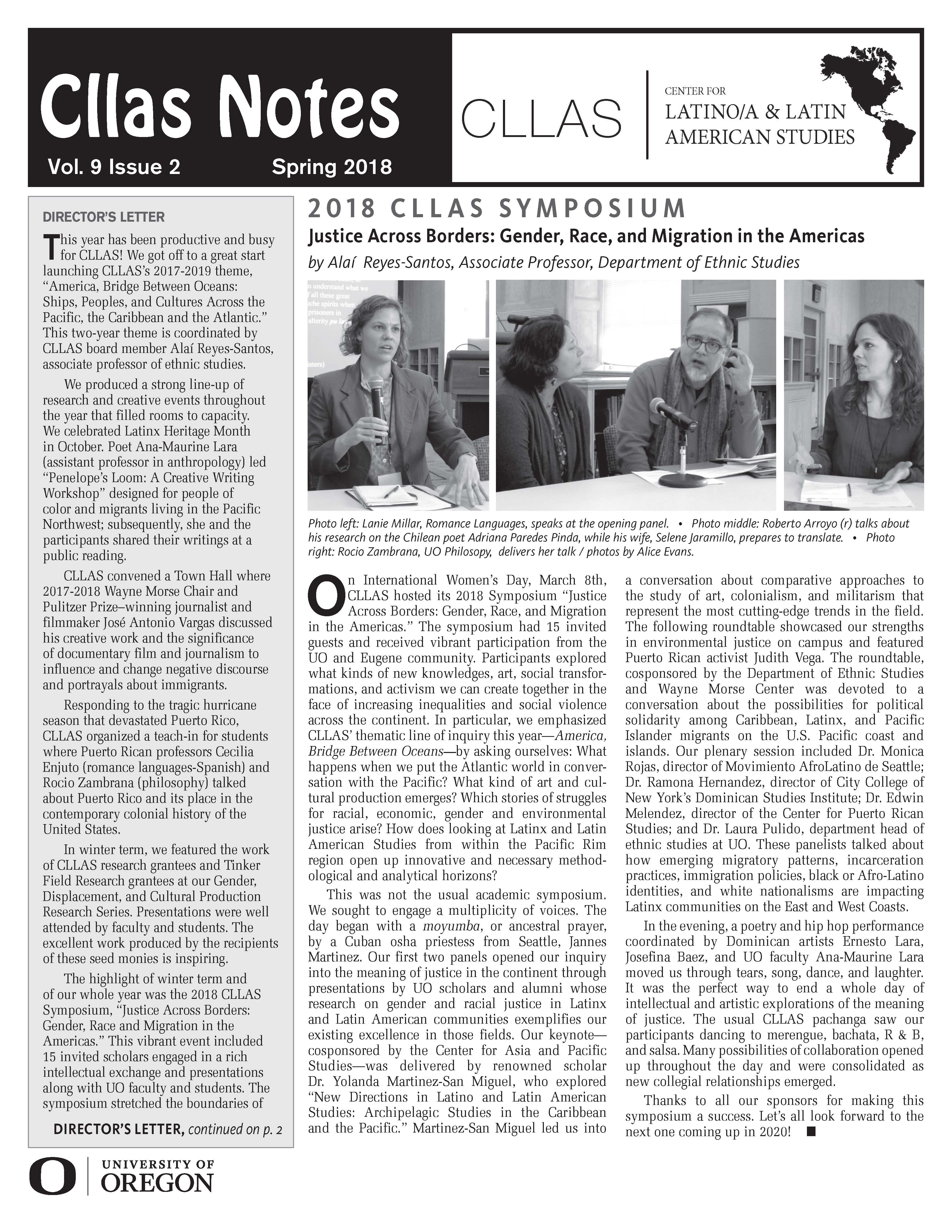 This spring issue of CLLAS Notes includes an article about the CLLAS 2018 symposium “Justice Across Borders: Gender, Race, and Migration in the Americas.” A report on the “UO Puerto Rico Project: Hurricane Maria and Its Aftermath,” written by CLLAS executive board member Alaí Reyes-Santos and one of her ethnic studies students, provides an excellent look at teaching through action.
