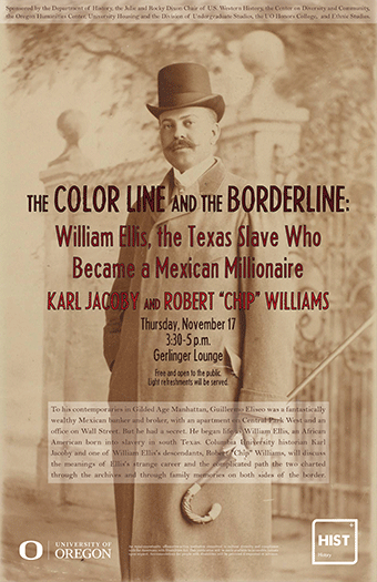 Following that presentation, Karl Jacoby will present a public talk, “The Color Line and the Borderline: William Ellis, the Texas Slave Who Became a Mexican Millionaire,” followed by a conversation with Robert “Chip” Williams, a descendant of William Ellis, and Marsha Weisiger, UO historian, whose ancestor owned the plantation where Ellis was born. The talk will take place on Thursday, November 17, 3:30-5, in Gerlinger Lounge. Light refreshments will be served. Copies of Professor Jacoby’s compelling book, The Strange Career of William Ellis, the Texas Slave Who Became a Mexican Millionaire, will be available for purchase.