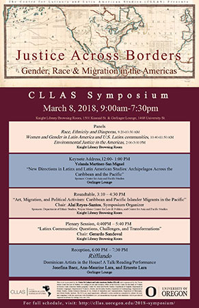 Fostering conversations about race, ethnicity, diasporas, gender, sexuality, migration, environmental justice, and culture that bridge the Atlantic and Pacific world, the symposium Justice Across Borders: Gender, Race, and Migration in the Americas explores what kind of new knowledges, art, social transformations, and activism we can create together in the face of increasing inequalities and social violence across the continent. We meditate on what contributions emerge from Pacific Rim-based research, art, advocacy work, and political movements when we put ourselves in conversation with scholars, artists, and activists based in the Atlantic coast. We will discuss the increasing visibility of Caribbean migrants in the Pacific Northwest, environmental justice issues in Mexico, the U.S., Puerto Rico and the Southern Cone, archipelagic studies that encompass Caribbean and Pacific islands, gender politics within Latin American and Latinx communities in Oregon, experiences of Latin Americans alongside Pacific Islanders in the Pacific Rim region, queer Latina and AfroLatin@ art, indigeneity, blackness and Jewish diasporas in Latin America, challenges faced by a variety of Latinx communities in the U.S., etc. From a Latinx and Latin American Studies perspective, we engage comparative and relational dialogues with fields such as Pacific Islander Studies, Asian and Asian American Studies, Black Studies, Native American Studies, among others, hoping to bring new light into the epistemic possibilities of our fields and the meaning of Justice for all of us.