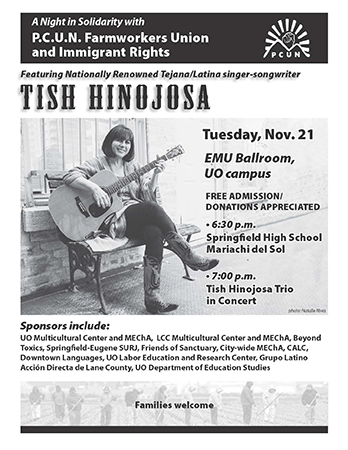 Sponsors include: UO Multicultural Center and MEChA, LCC Multicultural Center and MEChA, Beyond Toxics, Springfield-Eugene SURJ, Friends of Sanctuary, City-wide MEChA, CALC, Downtown Languages, UO Labor Education and Research Center, Grupo Latino Acción Directa de Lane County, UO Department of Education Studies.
