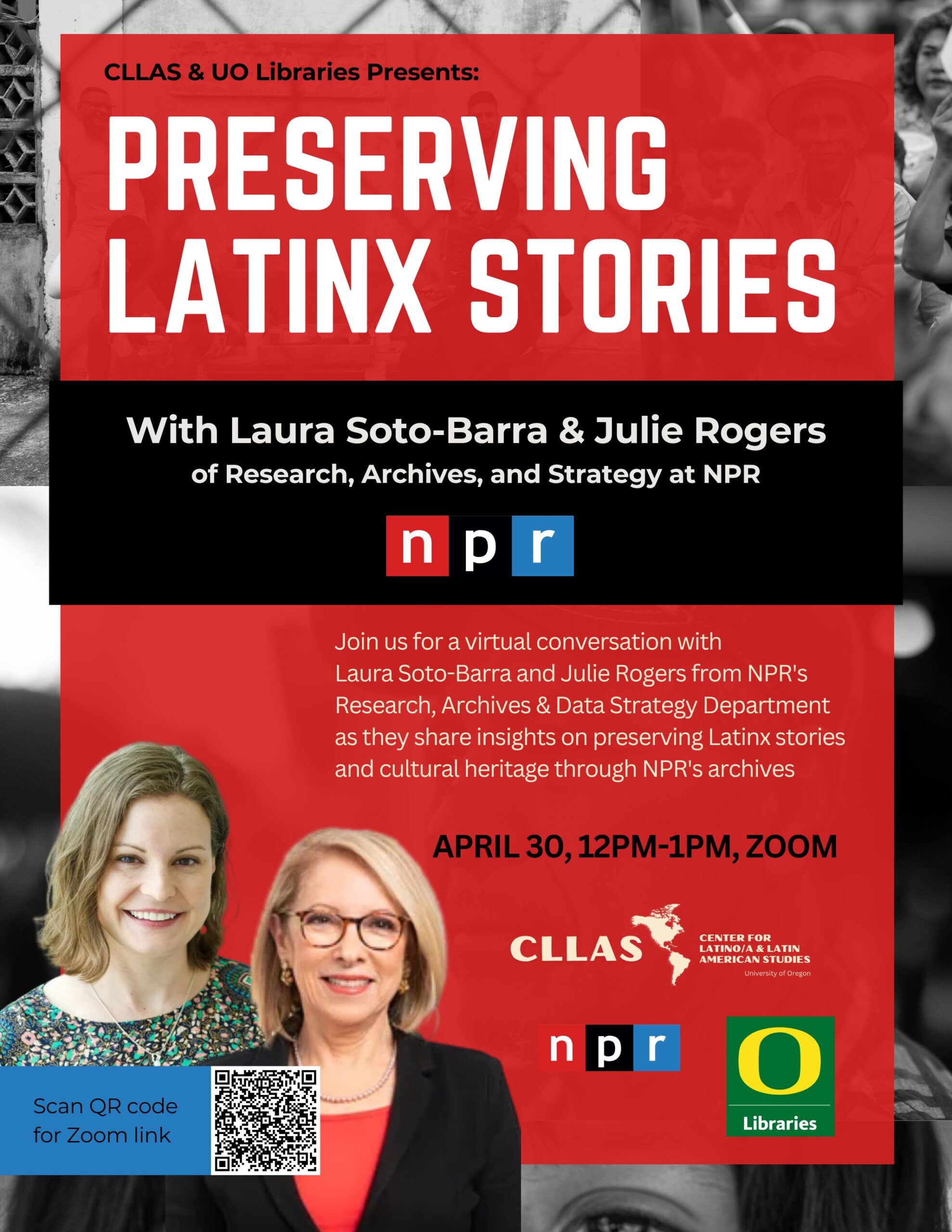 Join us for a virtual conversation with Laura Soto-Barra, and Julie Rogers of NPR’s Research, Archives, and Strategy Department. Learn about NPR’s archival work, the significance of preserving Latinx stories from the 1980s, and efforts to digitize and preserve Latinx voices. Moderated by Chris Chávez, CLLAS Director. Presented by the Center for Latino/a and Latin American Studies and UO Libraries.
