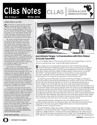 This winter issue of CLLAS Notes includes an article about CLLAS’s Town Hall conversation between activist journalist José Antonio Vargas and SOJC professor Chris Chávez.